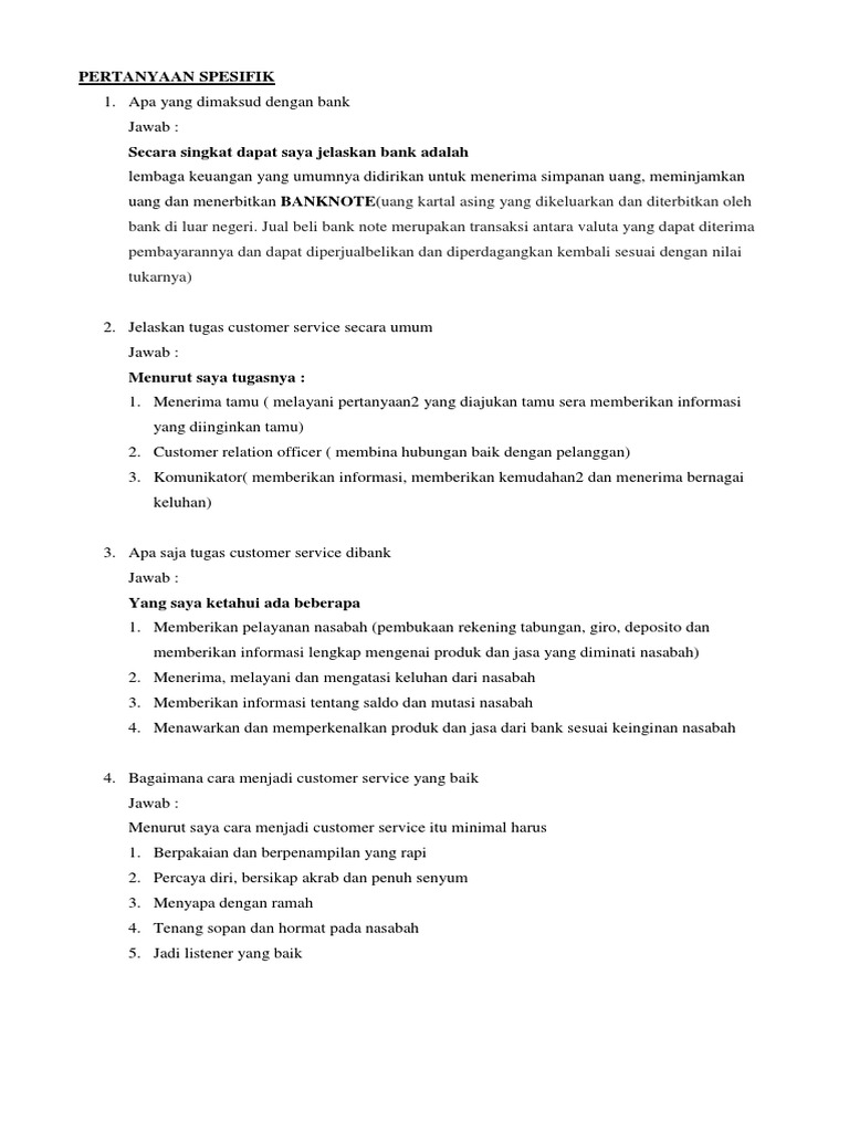 Untuk menjadi seorang customer service di perbankan, berikut ini merupakan kualifikasi yang harus dimiliki oleh seorang customer service bank :. Dan juga sesuai dengan produk yang dipilih oleh nasabah, terdapat fasilitas yang berbeda pula. Keramahan kepada nasabah supaya nasabah betah saat diberikan penjelasan