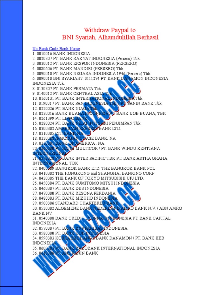 Lokasi seluruh jaringan pelayanan bni: 7 digit kode bank ini biasanya didapat dengan cara menggabungakn 3 digit kode bank + 4 digit kode cabang, hal ini sedikit menyulitkan dan apabila kita salah memasukkan 7 digit kode bank, proses tarik tunai atau verifikasi akan gagal dan kita akan dikenakan denda oleh paypal. Memang kode bank ini sudah tersedia di mesin atm, tetapi jika tidak tahu kode nya maka harus mencari.